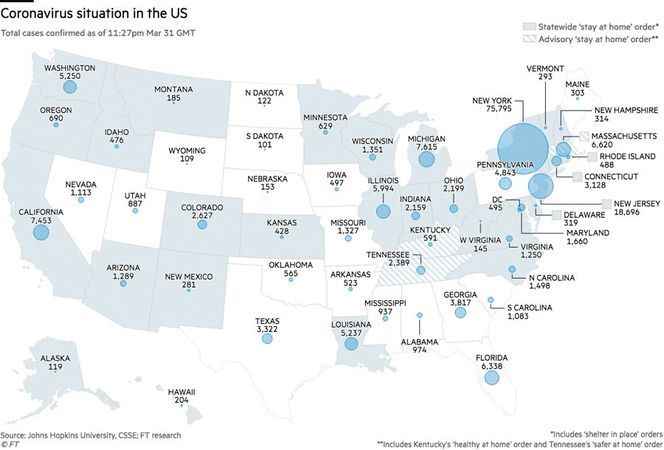 John Hopkins üniversitesi Çin'i sollayarak ilk sıraya oturan ABD'deki vaka dağılımını da duyurdu.