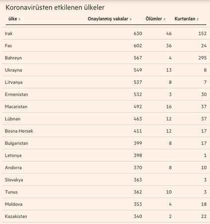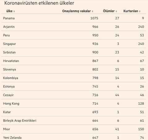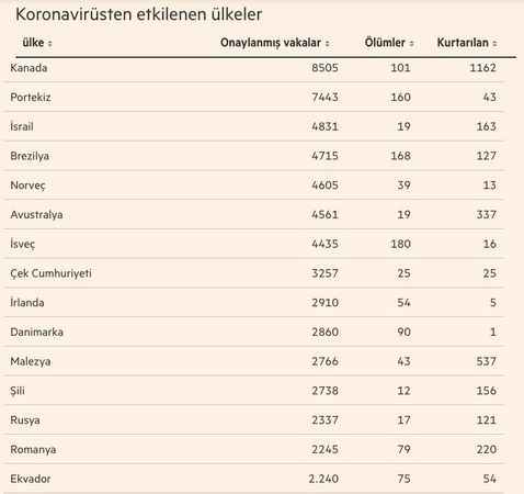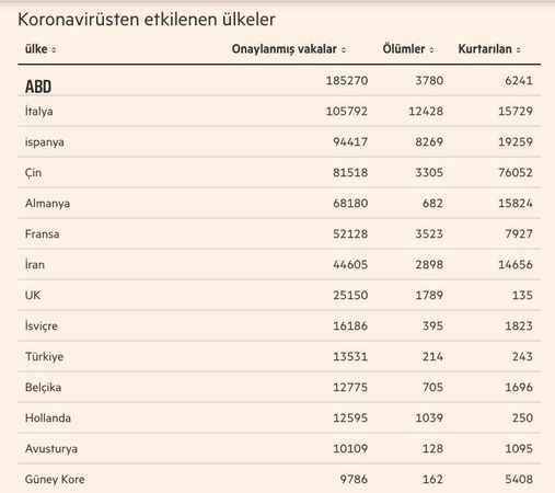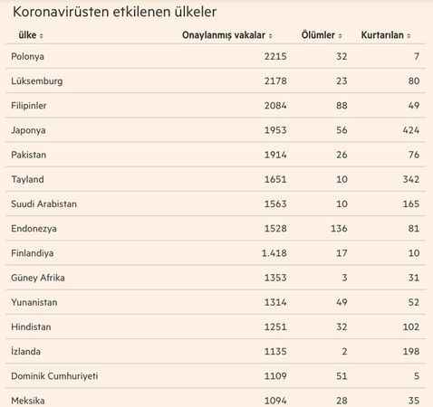 Dünya ülkelerinin koronovirüs vaka ve ölüm rakamları da şöyle: