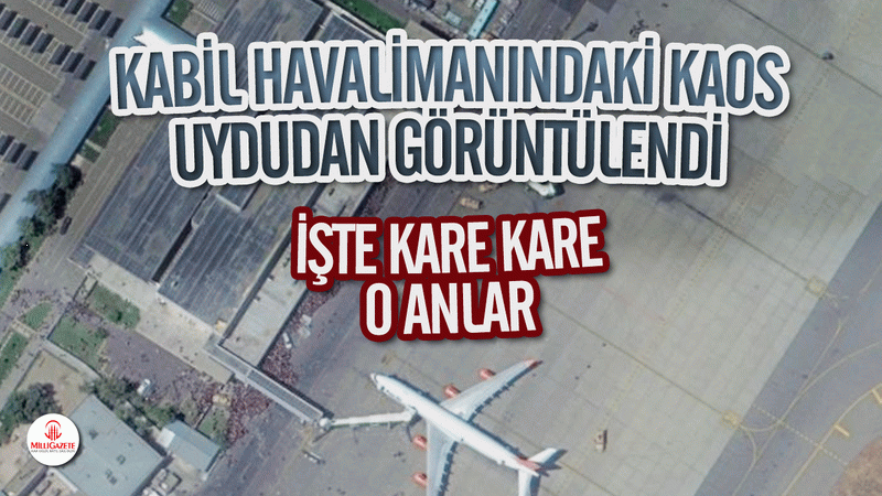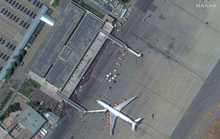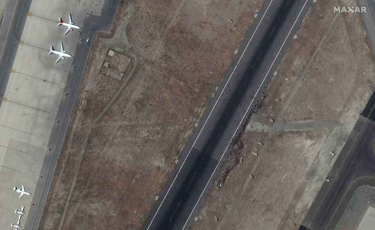 Pazartesi sabahı geç saatlerde çekilen uydu fotoğrafları, Afganların kaçmak için umutsuzca uçaklara binmeye çalışmasından kısa bir süre önce Hamid Karzai Uluslararası Havaalanı'nda yaşanan kaosu gözler önüne seriyor.