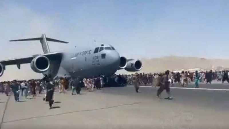 İnsanlar havaalanında oturma eylemi yaptı. Uçaklara binmek için çabaladı. Birçok Afgan piste yönelip hareket eden uçaklara binmeye çalıştı.