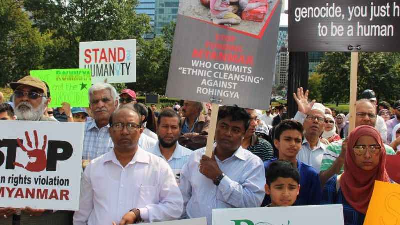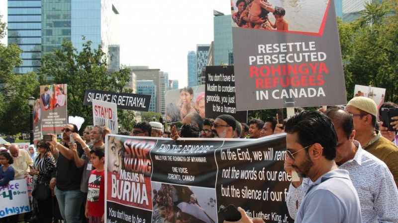 Toronto'daki Ontario Eyalet Parlamentosu bahçesinde toplanan binlerce Myanmarlıya, şehirde yaşayan diğer Müslüman topluluklar ile Kanada Birleşik Hristiyanlar Federasyonu da destek verdi. Parlamento binası önünde, Arakan'daki yakınlarının yaşadığı katliamları anlatan Myanmarlılar, Kanada hükümetini sorunu çözmede daha etkili davranmaya çağırdı.