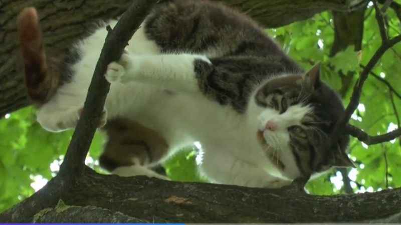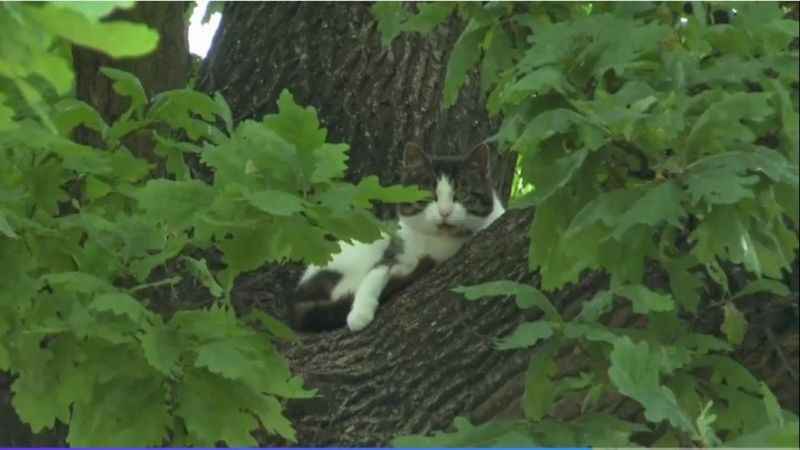 Altı yıldır parktaki bir meşe ağacında yaşayan kediyi birçok kere itfaiye ekipleri ve vatandaşlar kurtarmaya çalışsa da kedi ağaçta kalmaya devam etti.