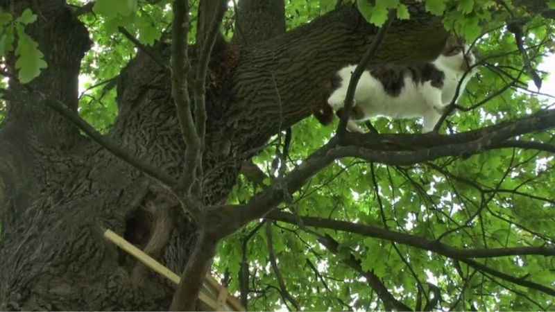 Polonya'da daha yavru kediyken kovalandığı için korkup ağaca tırmanan sevimli kedi, bir daha ağaçtan inmedi.