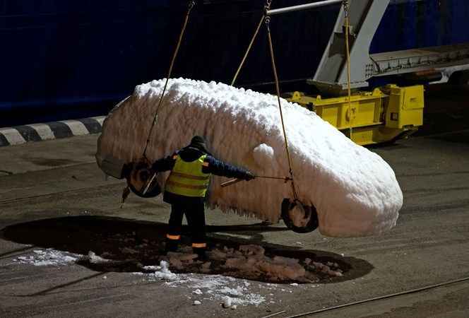 Buz küpleri halinde gemiden indirilen araçların üzerindeki tabaka kırıldıktan sonra bayilere teslim ediliyor.