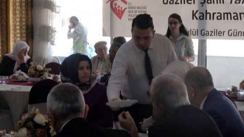 DÜZCE Valiliği'nin 19 Eylül Gaziler Günü kapsamında düzenlediği kahvaltıda kent protokoline garsonlar servis yaparken, gaziler ve yakınları sıraya girip kendileri aldı.