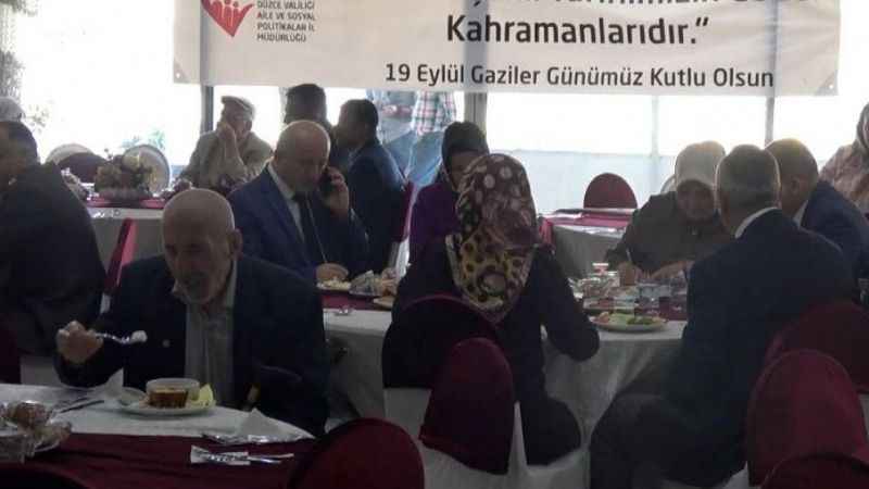 Gaziler Günü nedeniyle önce Anıtpark'ta tören düzenlendi.Valilik, Belediye Başkanlığı, Garnizon Komutanlığı veMuharip Gaziler DerneğiDüzce Şubesi'nce AtatürkAnıtı'na çelenk konuldu. Dernek Başkanı Vedat Nefesoğlu'nun konuşması ardından parktaki tören sona erdi. Daha sonra Valilik tarafından gaziler ve şehit yakınları için verilen kahvaltı programına geçildi. Kahvaltıya ValiZülkif Dağlı'nın yanındaAK Parti Düzce Milletvekili Ayşe Keşir, İl Jandarma Komutanı Jandarma Kıdemli Albay Yılmaz Özdemir, İl Emniyet Müdürü Hüseyin Deniz, vali yardımcıları, daire müdürleri de katıldı. Vali Dağlı, Milletvekili Keşir, Aile ve Sosyal Politikalar Müdürü Zeki Yıldırım, Muharip Gaziler Derneği Şubesi Başkanı Vedat Nefesoğlu'nun oturduğu masa ile diğer protokol üyelerinin oturduğu masalara garsonlar tarafından servis yapıldı.Gaziler ve şehit yakınları ise kahvaltılarını sıraya girip kendileri aldı. Gazilerden bazıları yaşlı olmaları nedeniyle tabaklarına kahvaltılık alırken zorlandı. Bir gazinin, dolu tabağı ve bastonuylamasasına yürürken zorlandığı gözlendi. Gaziler ve şehit yakınları, kahvaltı ardından otelden ayrıldı.