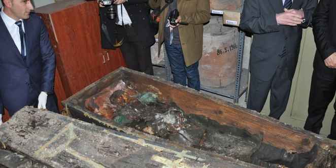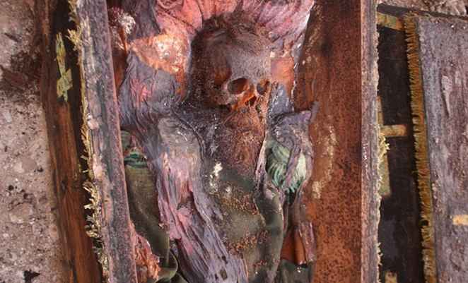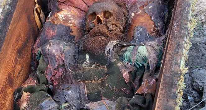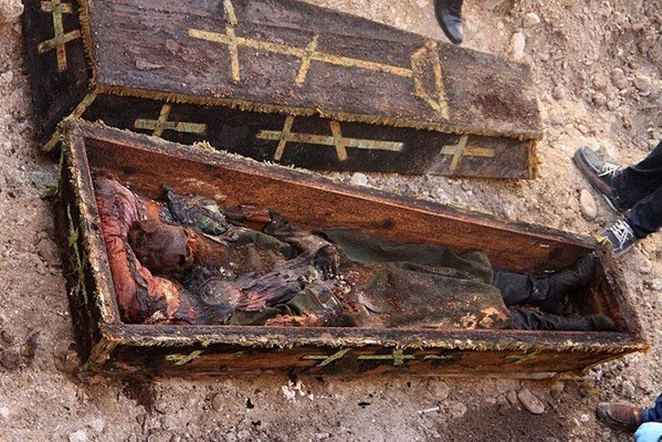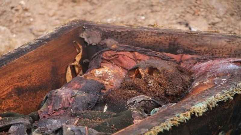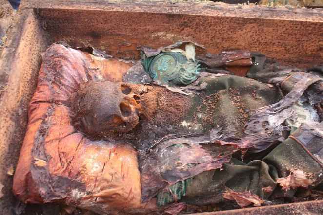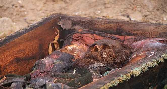 Özel bölmede olan tabut çıkarılıp kapağı açıldığında, sakalları, paltosu, çizmeleri üzerinde duran bir iskelet bulundu. Askeri kıyafetin apoletinde 3 yıldız ve 20 rakamı bulunduğu belirlendi.