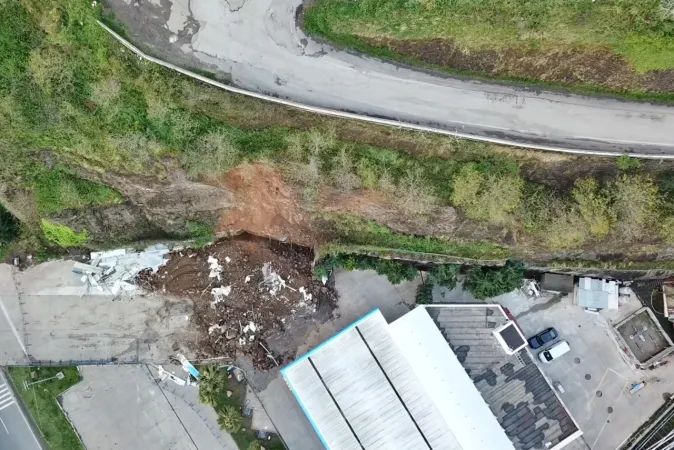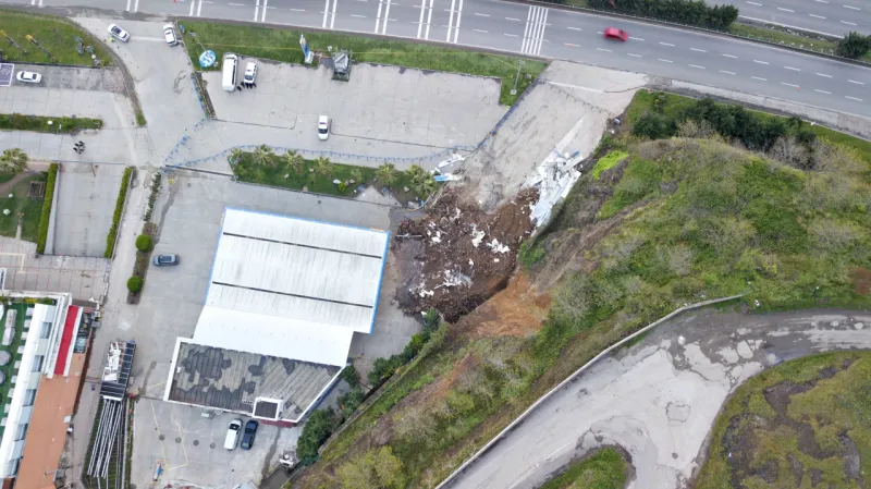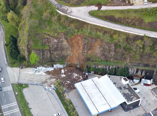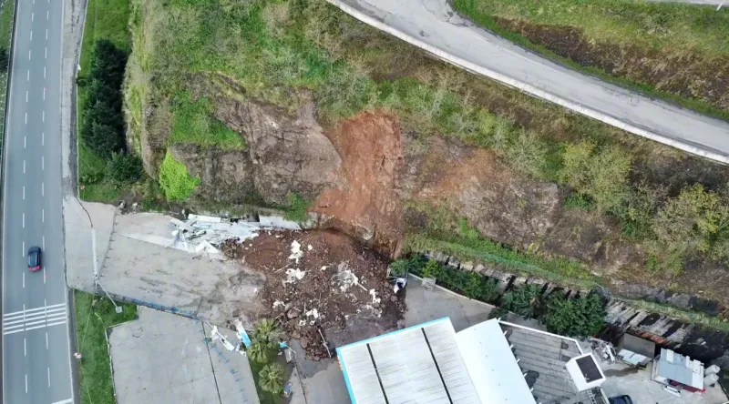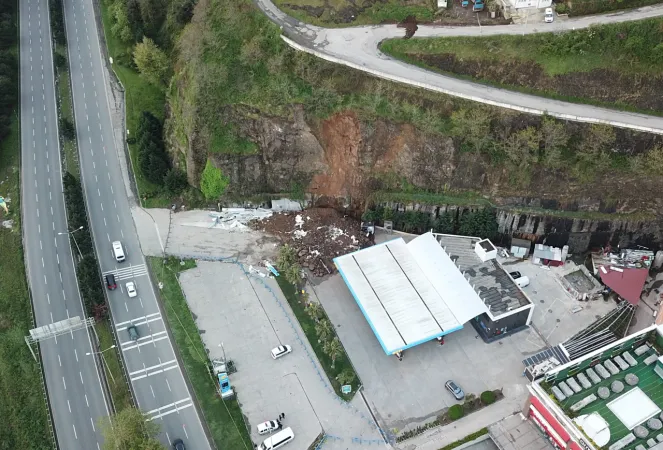 Samsun'da meydana gelen heyelanda akaryakıt istasyonunun oto yıkama bölümünün üstüne kaya parçaları düştü.