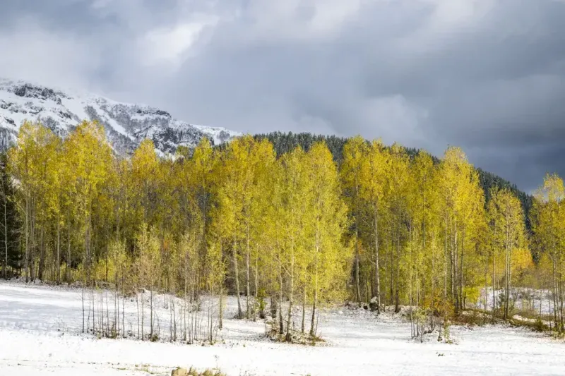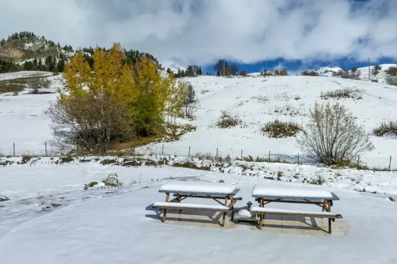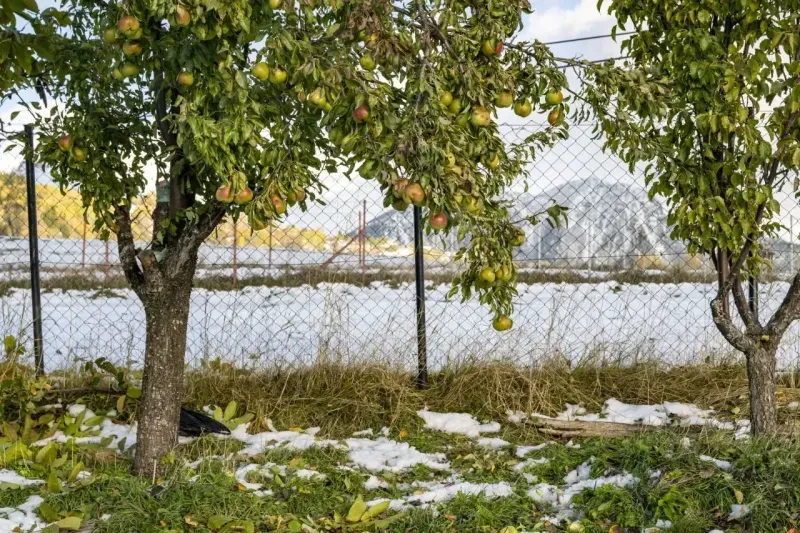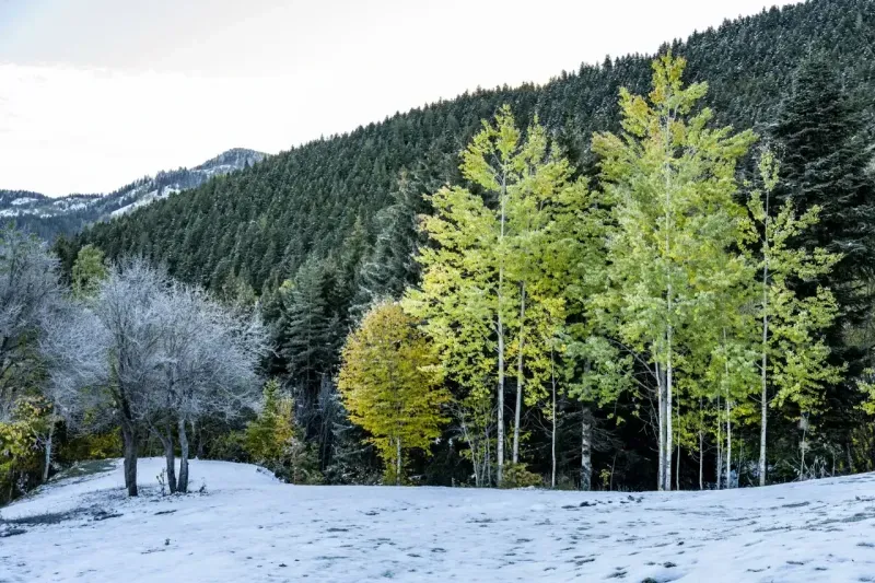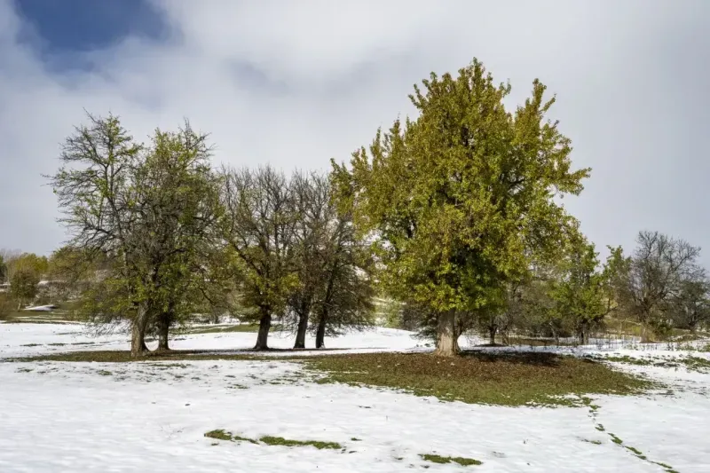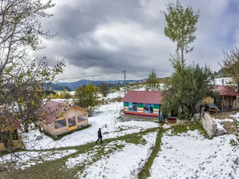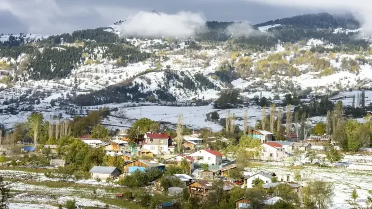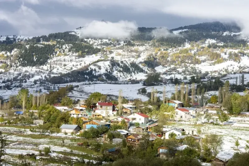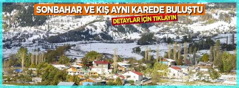 İlçeye bağlı Pınarlı köyünde sonbaharın renklerine bürünen ağaçların karla kaplanmasıyla iki mevsim bir arada yaşanıyor.