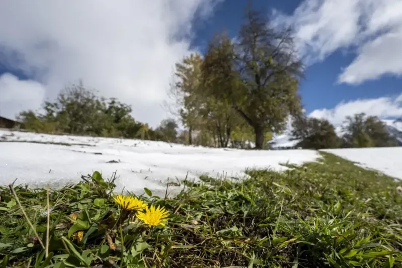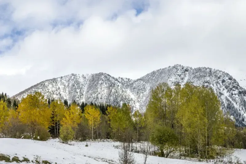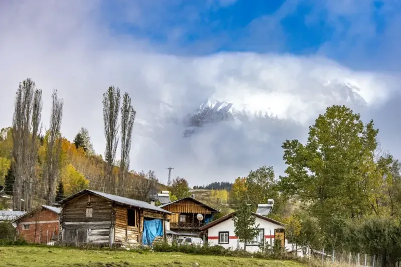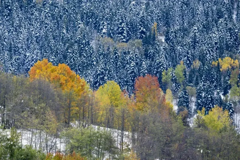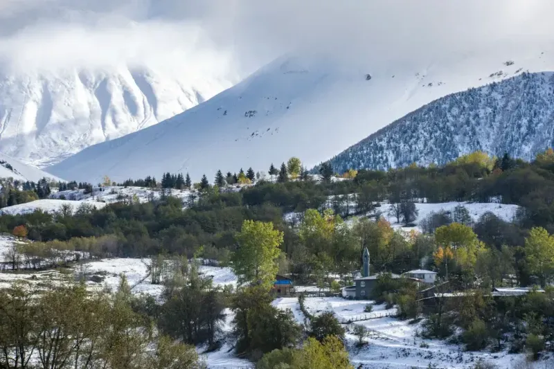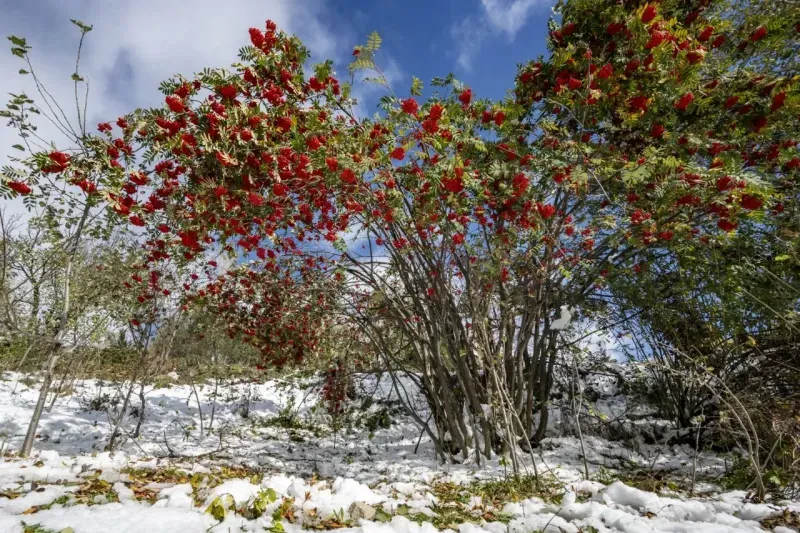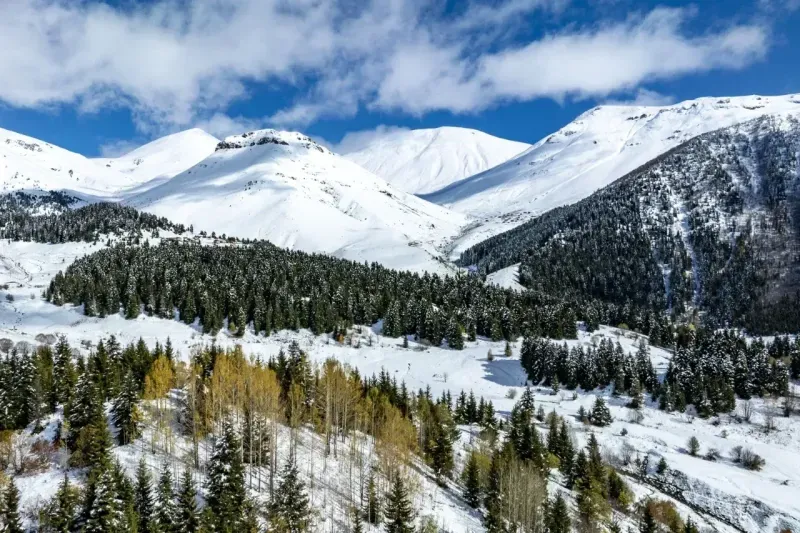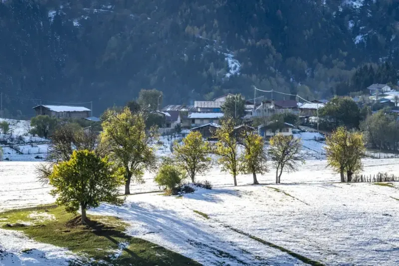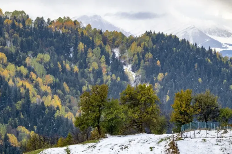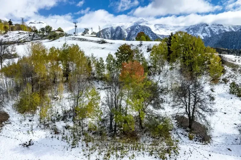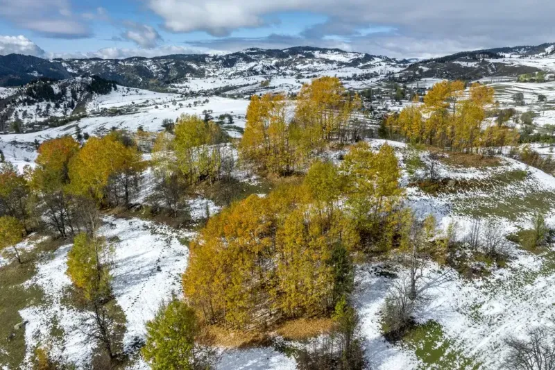 Artvin'in Şavşat ilçesinde ağaçların sonbaharın renklerine bürünmeye başladığı dönemde etkili olan kar yağışı, doğanın farklı güzelliklerini tek karede görme imkanı sundu.