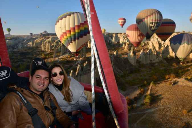 Sıcak hava balonculuğunun dünyadaki önemli merkezlerinden biri olan Kapadokya’da balon turlarına katılan ziyaretçiler, bölgenin sonbahar güzelliğini gökyüzünden de görerek fotoğrafla ölümsüzleştiriyor.
