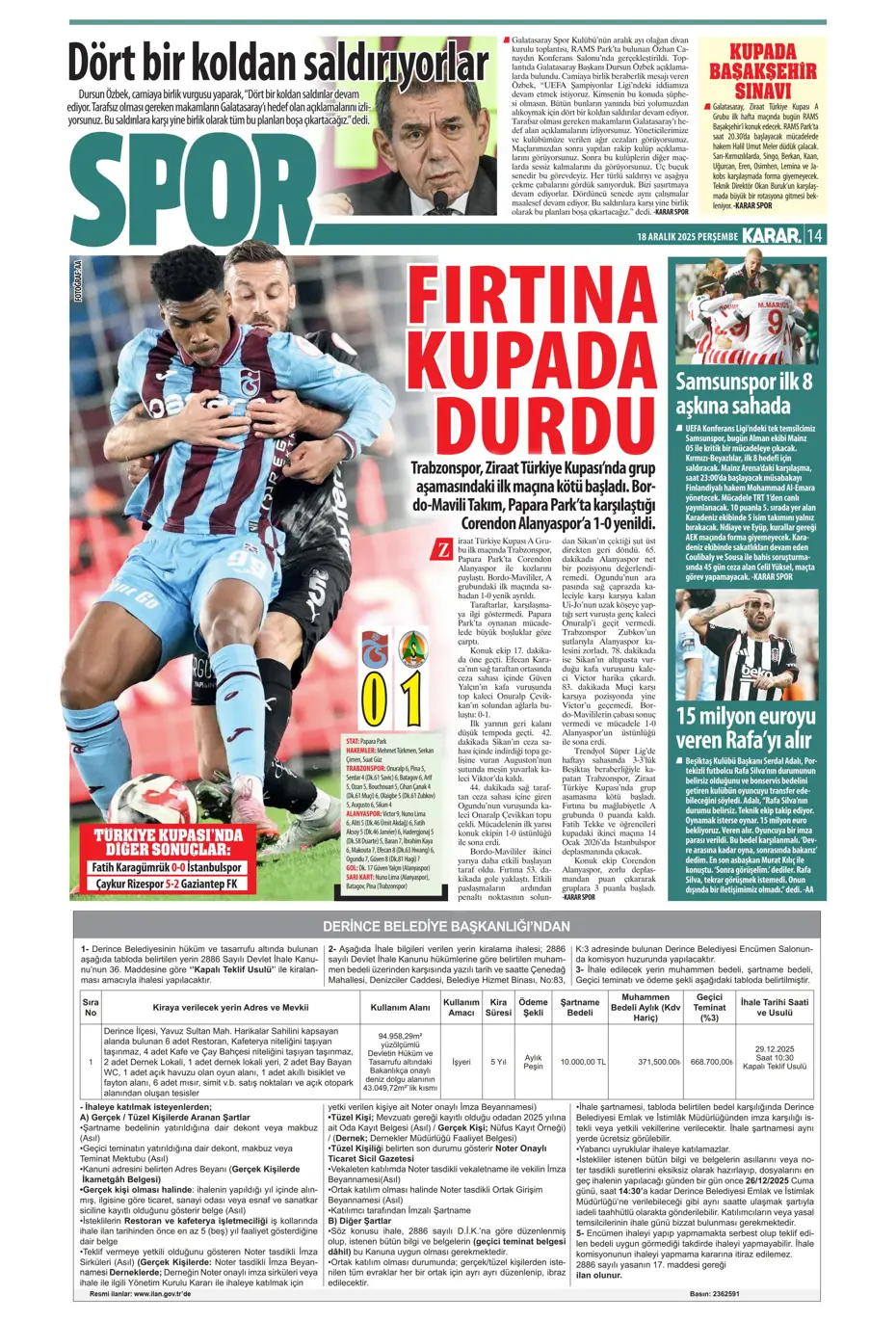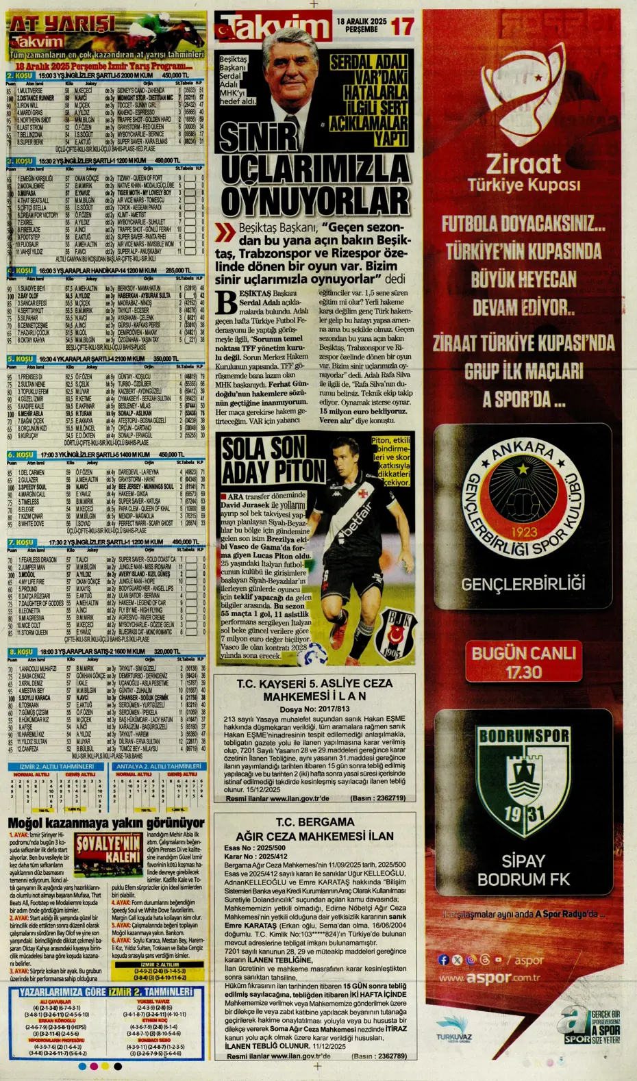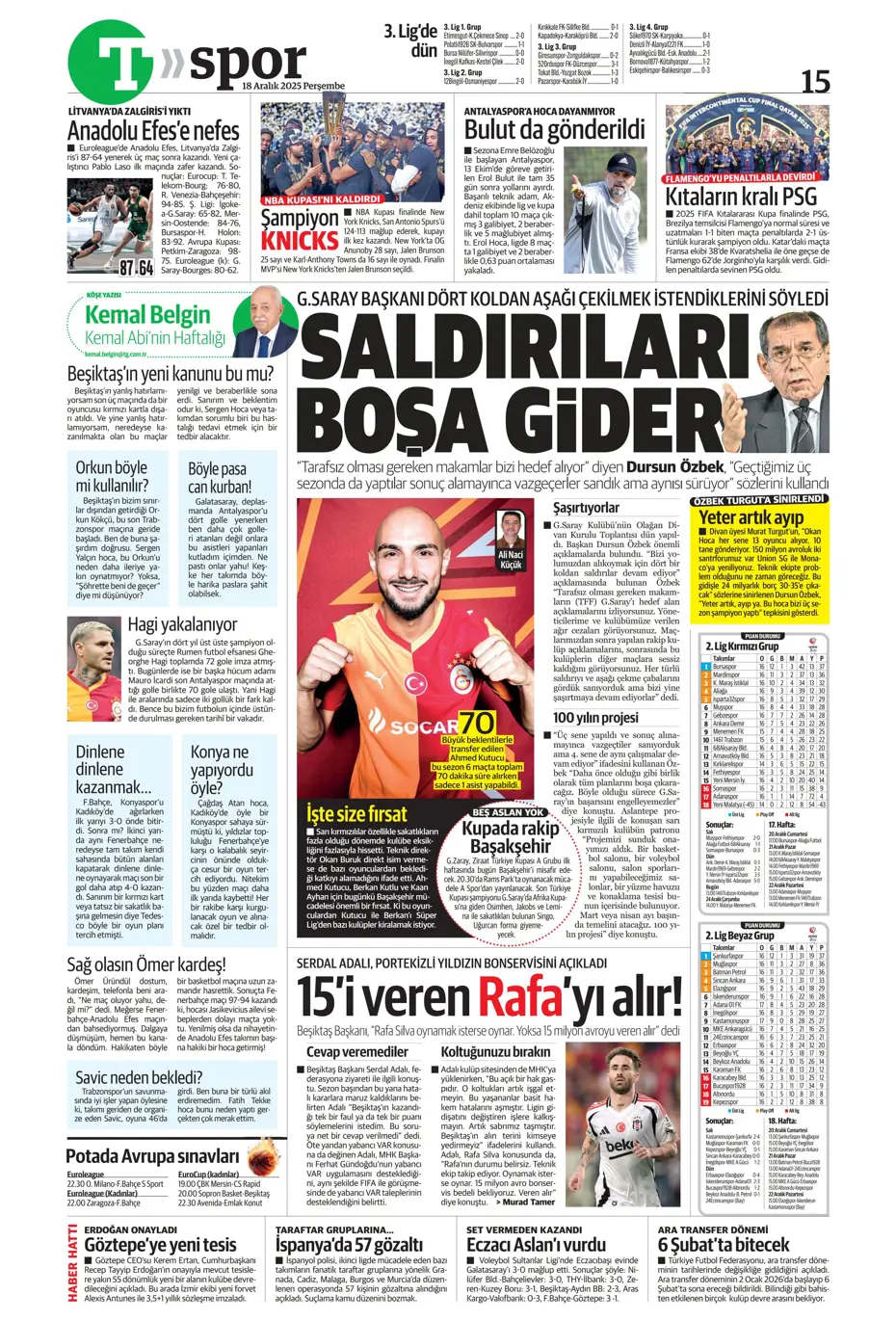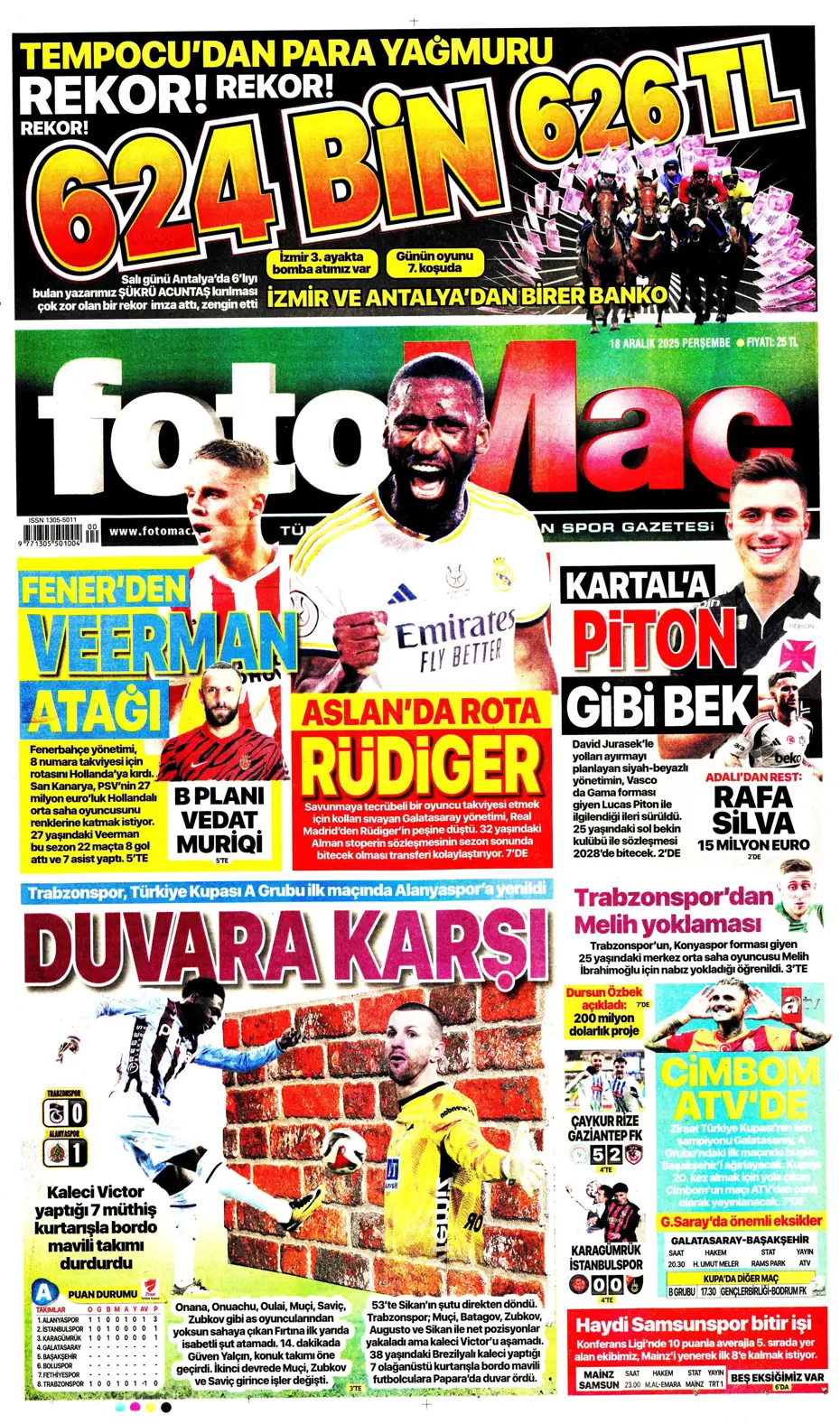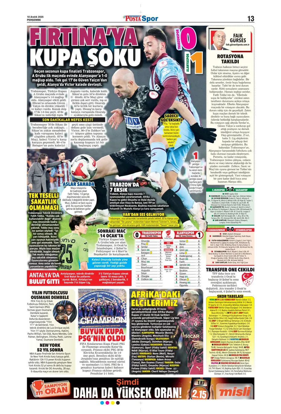 Günün spor manşetlerinde, spor gündemiyle alakalı en yeni gelişmeler yerlerini aldı. 18 Aralık 2025 tarihli gazetelerin spor sayfalarına, Beşiktaş, Fenerbahçe, Galatasaray ve Trabzonspor'a dair haberlere, bir çırpıda göz atın. İşte 18 Aralık 2025 gazete manşetlerinde spor haberleri.