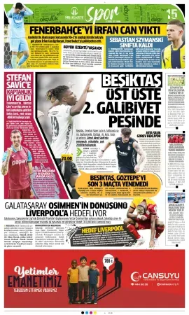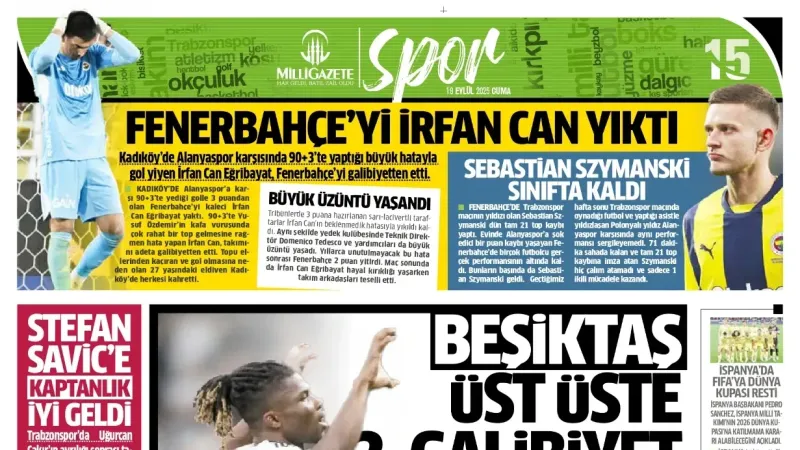 Günün spor manşetlerinde, spor gündemiyle alakalı en yeni gelişmeler yerlerini aldı. 19 Eylül 2025 tarihli gazetelerin spor sayfalarına, Beşiktaş, Fenerbahçe, Galatasaray ve Trabzonspor'a dair haberlere, bir çırpıda göz atın. İşte 19 Eylül 2025 gazete manşetlerinde spor haberleri.