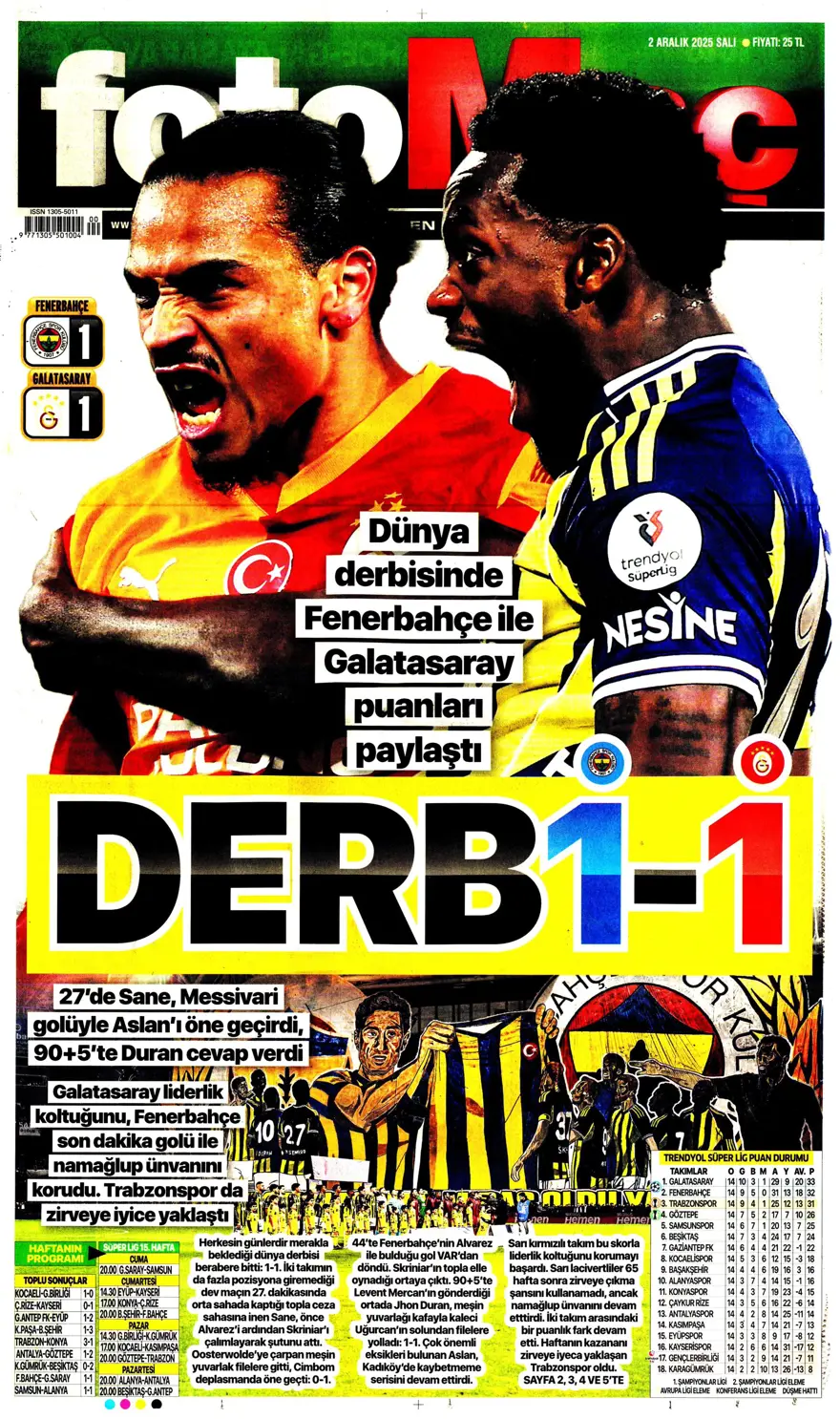 Zirvede yer alan iki dev ekip, derbide karşı karşıya gelirken taraflar 1-1 beraberlikle sahadan ayrıldılar.