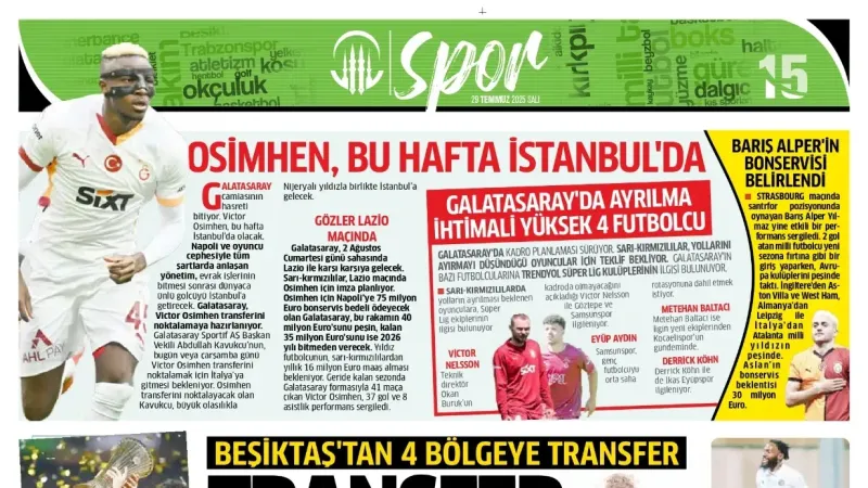Günün spor manşetlerinde, spor gündemiyle alakalı en yeni gelişmeler yerlerini aldı. 29 Temmuz 2025 tarihli gazetelerin spor sayfalarına, Beşiktaş, Fenerbahçe, Galatasaray ve Trabzonspor'a dair haberlere, bir çırpıda göz atın. İşte 29 Temmuz 2025 gazete manşetlerinde spor haberleri.