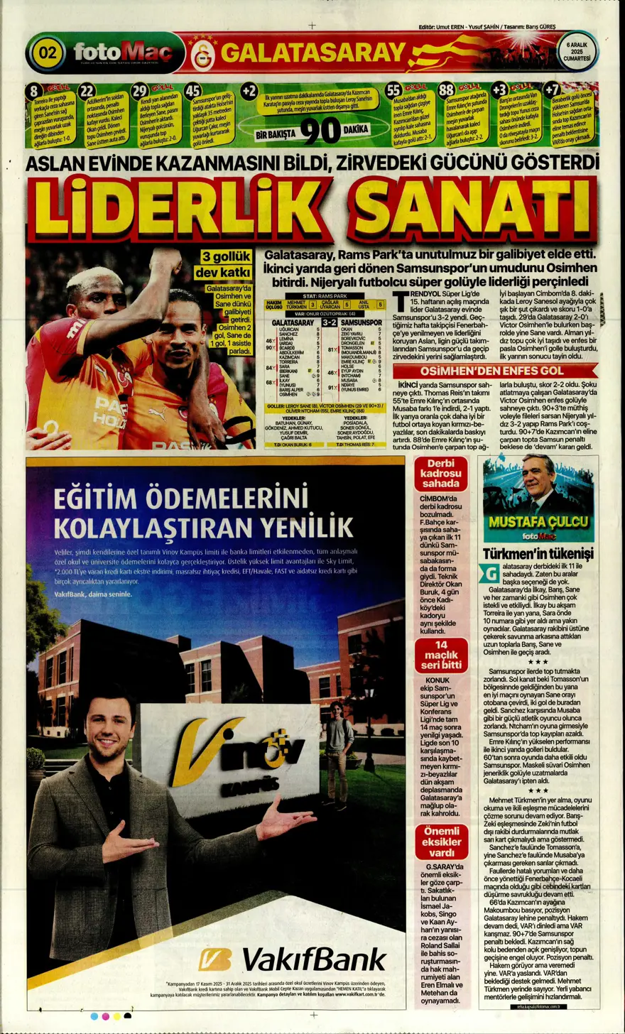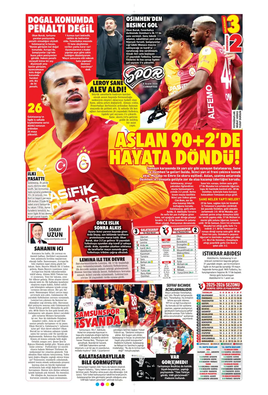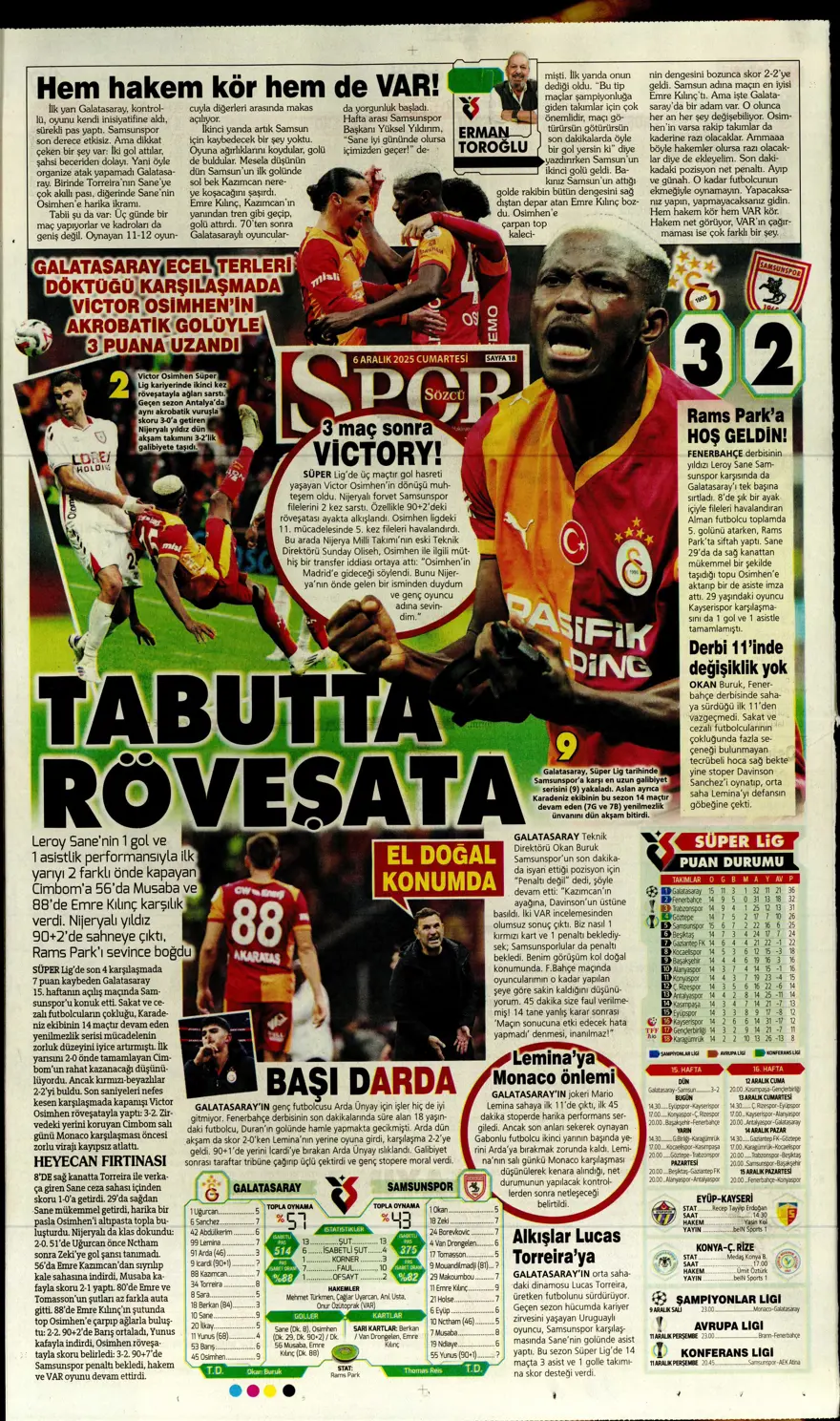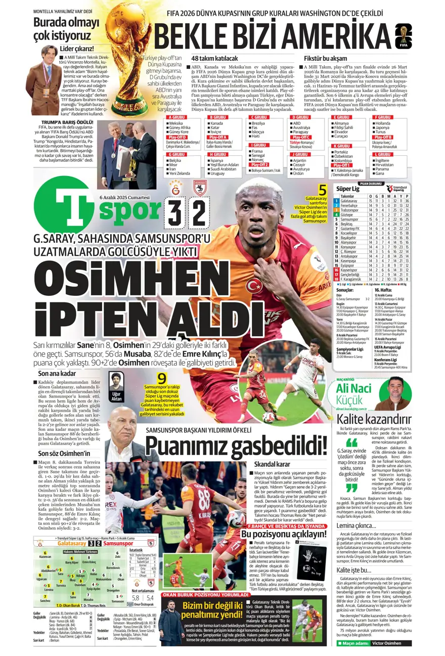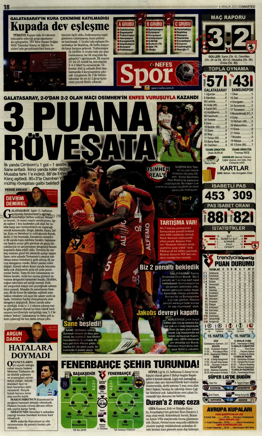 Süper Lig'de şampiyonluk yarışı son haftalarda nefes kesiyor. Derbide galibiyeti son anda kaçıran Galatasaray, Süper Lig'in 15. haftasının açılış maçında Samsunspor'u mağlup etti.