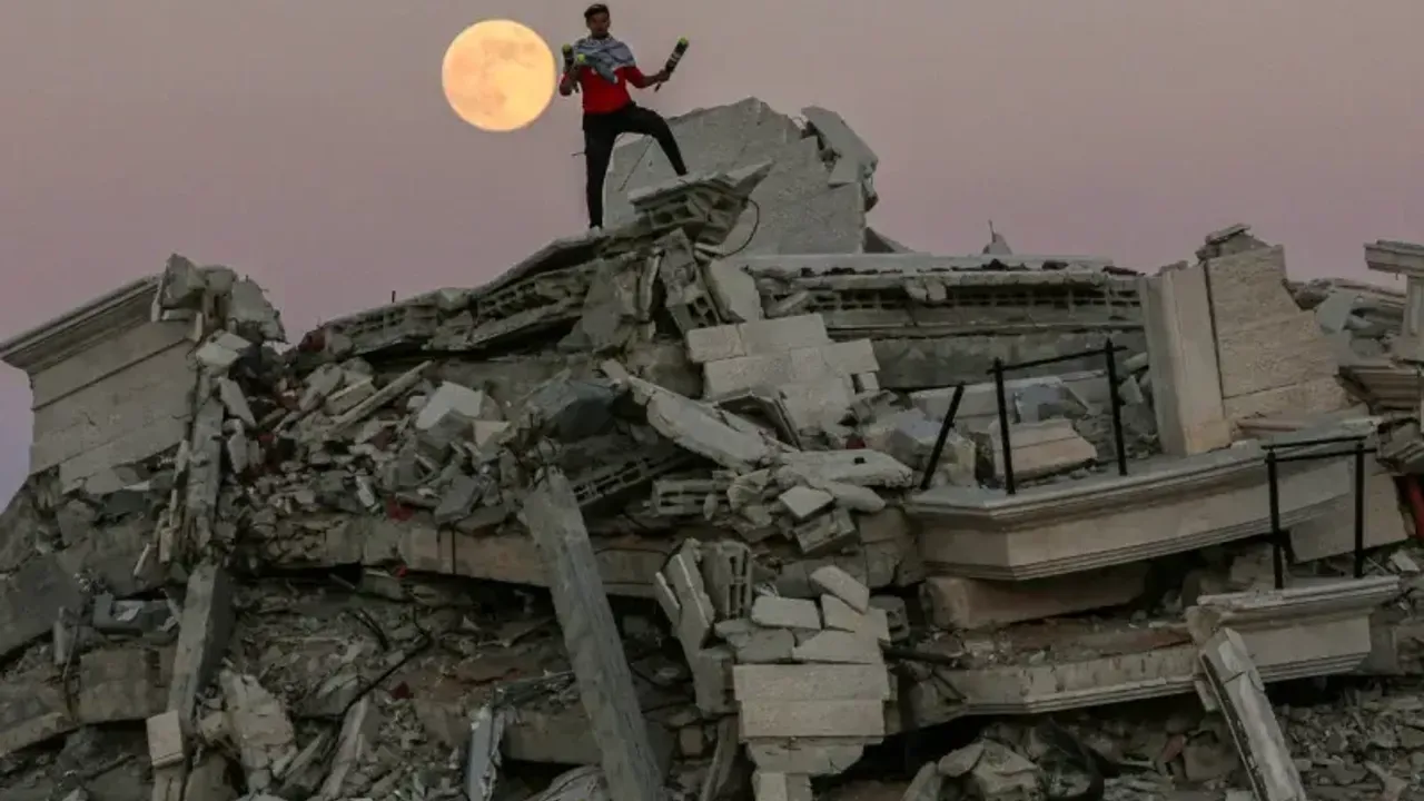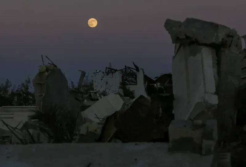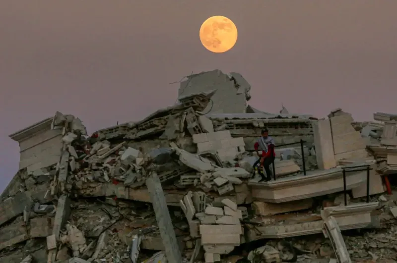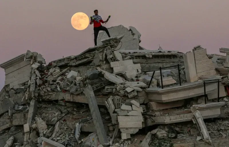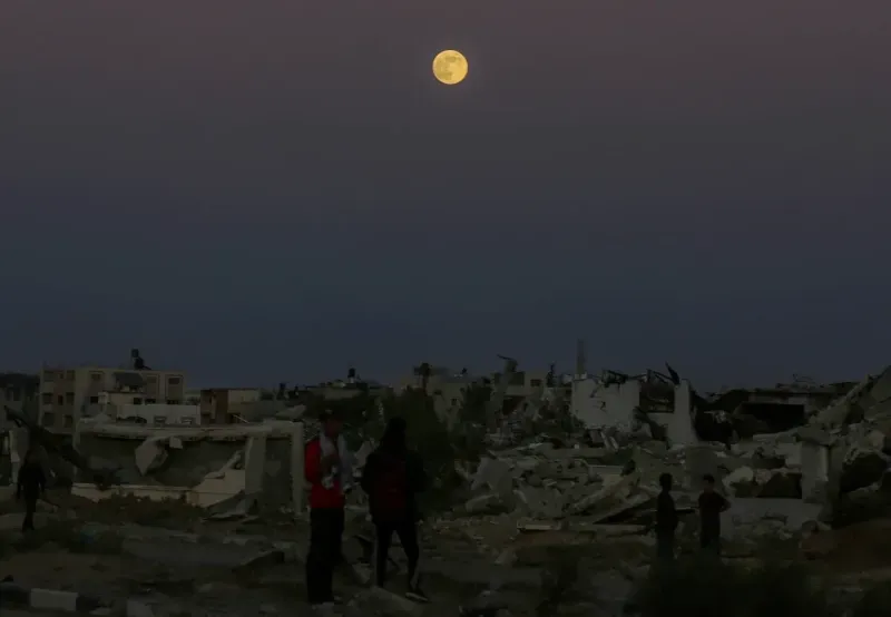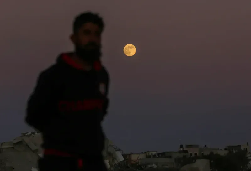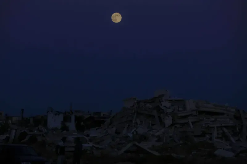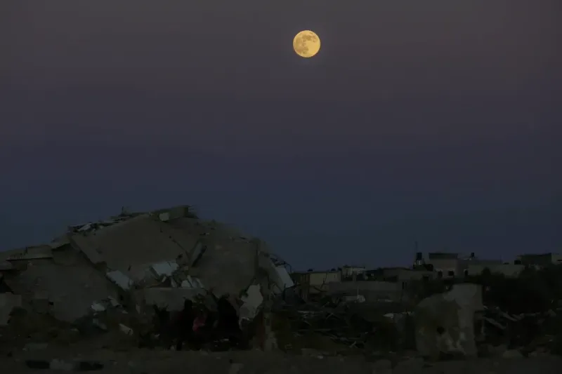 İşgalci İsrail saldırıları altındaki Gazze Şeridi'nin orta kesiminde yer alan Megazi Mülteci Kampı'nda, akşam saatlerinde beliren 'Süper Ay', yıkık binaların üzerinde görüntülendi.