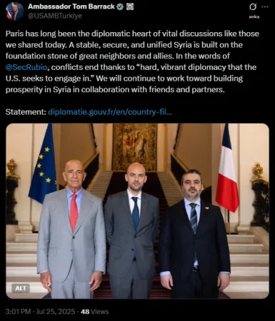 Barrack, sosyal medya hesabından yaptığı paylaşımda görüşmeye dair, "Paris, bugünkü gibi hayati öneme sahip tartışmaların uzun süredir diplomatik merkezi olmuştur. İstikrarlı, güvenli ve birleşik bir Suriye, iyi komşular ve müttefikler temelinde inşa edilir. Dışişleri Bakanı Marco Rubio'nun sözleriyle, çatışmalar 'ABD'nin dahil olmaya çalıştığı zorlu ve dinamik diplomasi' sayesinde sona erer. Dostlarımız ve ortaklarımızla işbirliği içinde Suriye'de refahın sağlanması için çalışmaya devam edeceğiz" ifadelerini kullandı.