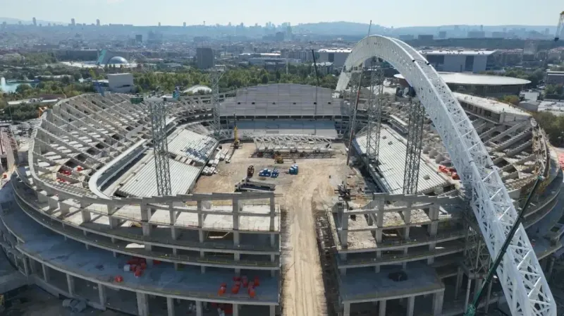 Modern mimarisiyle dikkat çeken ve futbol topu görünümünde tasarlanan 45 bin kişilik kapasiteli stadyumu gezen Başkan Sungur ve beraberindeki heyet, yetkililerden çalışmalar hakkında bilgi aldıktan sonra stadyum inşaatı önünde toplu olarak hatıra fotoğrafı çektirdi.