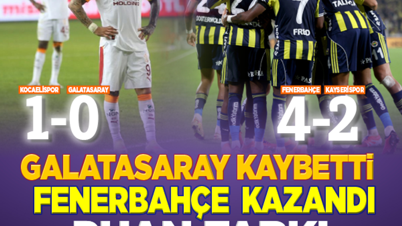 Trendyol Süper Lig'in 12. haftasında zirve yarışını sürdüren Galatasaray ve Fenerbahçe arasındaki puan farkı 1'e düştü. Fenerbahçe Kadıköy'de Kayseri Kayserispor'u 4-2'lik skorla geçerken, Galatasaray Kocaelispor'a deplasmanda 1-0 yenildi. İki takım arasında puan farkı ise 1'e düştü. Galatasaray 29 puanla zirvedeki yerini korurken, Fenerbahçe 28 puan ile ikinci sırada yer aldı.