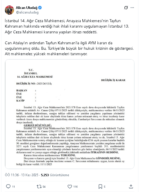 Uludağ, "Can Atalay'ın ardından Tayfun Kahraman'la ilgili AYM kararı da uygulanmamış oldu. Bu, Türkiye'de büyük bir hukuk krizinin de göstergesi. Alt mahkemeler, yüksek mahkemeleri tanımıyor" dedi.