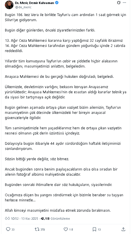 "Bugün 186. kez Vera ile birlikte Tayfun’u cam ardından 1 saat görmek için Silivri’ye gidiyorum.