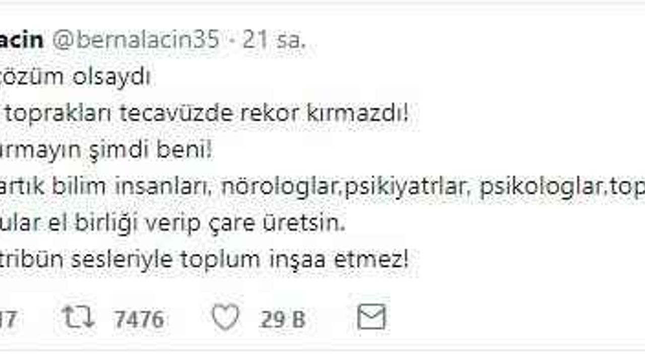Berna Laçin’in, sosyal medya hesabı Twitter’dan yaptığı yalan bilgiler içeren paylaşım, büyük tepki gördü. Tecavüzün en çok yaşandığı 10 ülke şöyle: “1- ABD, 2- Güney Afrika, 3- İsveç, 4- Hindistan, 5- İngiltere, 6- Almanya, 7- Fransa, 8- Kanada, 9- Sri Lanka, 10- Etiyopya”. Diğer yandan, oyuncu Berna Laçin hakkında Twitter hesabında yaptığı bir paylaşımında “halkın dini değerlerini aşağılama” suçunu işlediği iddiasıyla soruşturma başlatıldı.