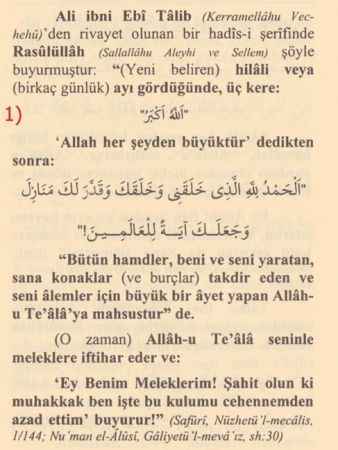 Hazreti Ali ibni Ebi Talib (Kerramellahu vechehü)'den rivayet olunan bir Hadis-i Şerifinde Sevgili Peygamberimiz Hazreti Muhammed (sallallahü aleyhi ve sellem) Ramazan hilalini gördüğünde şöyle buyurmuştur: