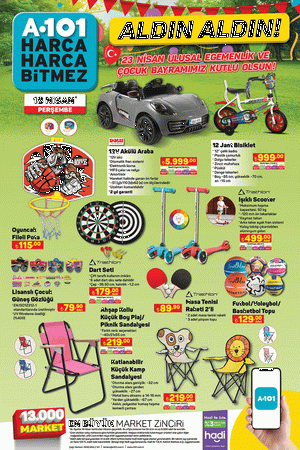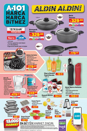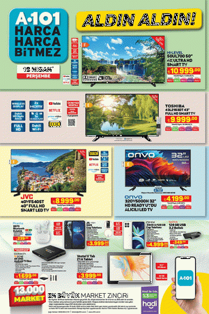 A101 market güncel aktüel ürünler kataloğu duyuruldu. 18 Nisan Perşembe günü A101 aktüel ürünler kataloğunda Renkli Cam Kase, Borosilikat Bardak ve Pipet Seti 6 Parça, Desenli Seramik Pasta Tabağı, Samsung Cyclone Elektrikli Süpürge, Arzum Violet Epilasyon Cihazı, Akel Gözleme ve Katmer Sacı, Vestel V Tab Z1 A Tablet, Hi-Level 50' 4K Ultra HD Smart Tv, Toshiba 43' Full HD Smart Tv, JVC 40' Full HD Smart Led Tv, Onvo 32' HD Ready Uydu Alıcılı Led Tv, Taida İkili Katlanır Mekanizmalı Yataklı Uzanma Koltuğu, Cem Nero Karnıyarık Tencere ve Cem Nero Derin Tencere satışa çıkacak.