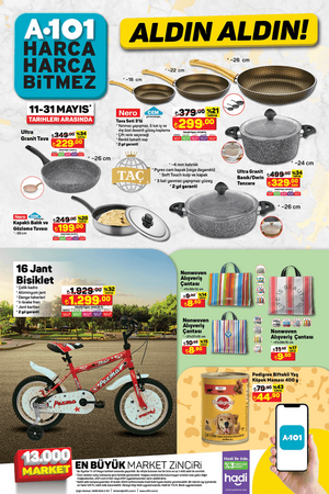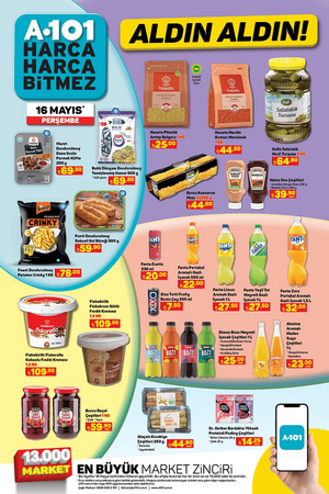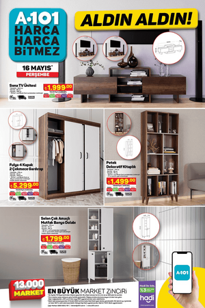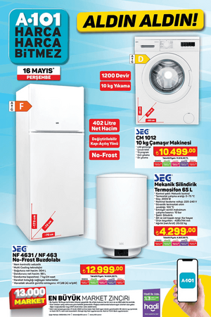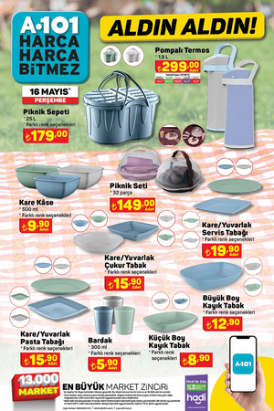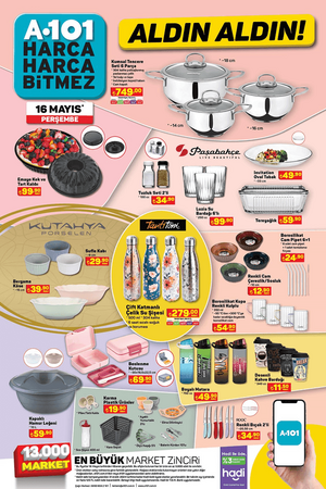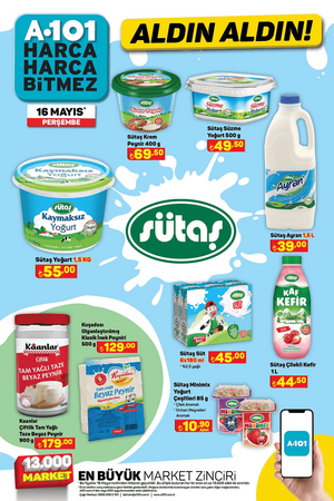Öte yandan A101 market şubelerinde 16 Mayıs Perşembe günü, 1.5 kg Sütaş Yoğurt 55 TL, 500 g Sütaş Süzme Yoğurt 49.50 TL, 1.5 L Sütaş Ayran 39 TL, 1 L Sütaş Çilekli Kefir 44.50 TL, Pure Baby Çocuk Bezi Çeşitleri 199 TL, Triathlon Uzaktan Kumandalı Koşu ve Yürüyüş Bandı 5.599 TL, Triathlon Ayarlanabilir Barfiks Çubuğu 249 TL, Triathlon Ahşap Kaykay 299 TL, Oyuncak 12V Kumandalı Akülü Araba 5.999 TL, Oyuncak Tatlı Tepsisi 129 TL, Oyuncak Little Princess Bulaşık Sepeti 149 TL, Oyuncak Barbie Parıltılı Bebek 169 TL, Oyuncak Çim Biçme Makinesi 89.90 TL, Oyuncak Çekçekli Araba 17 Parça 279 TL, Piknik Sepeti 179 TL, Kiwi Gazlı Berbekü 3.999 TL, Kiwi Çubuk El Blender'ı 329 TL, Kiwi Elektrikli Cezve 399 TL, Fantom Dikey Süpürge 1.299 TL, Arzum Saç Kurutma Makinesi 599 TL, Kiwi Standlı Vantilatör 699 TL, SEG No-Frost Buzdolabı 12.999 TL ve SEG 10 kg Çamaşır Makinesi 10.499 TL satışa çıkacak.