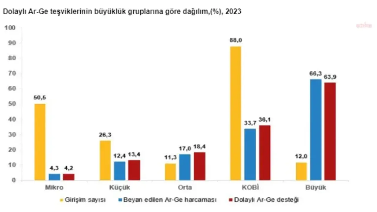 Dolaylı Ar-Ge teşviklerinden yararlanan girişimler büyüklük gruplarına göre ele alındığında, 9 bin 30 girişimin yüzde 88’inin küçük ve orta büyüklükteki işletmeler (KOBİ) olduğu görüldü. Girişim sayısı bakımından Ar-Ge teşviklerinden yararlanan büyük ölçekli girişimlerin payı yüzde 12 iken bu girişimler dolaylı Ar-Ge teşviklerinin yüzde 63,9'undan yararlandı.