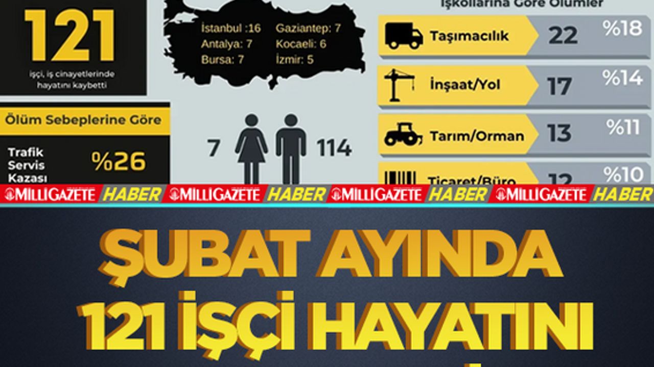 İşçi Sağlığı ve iş Güvenliği’nin (İSİG) raporuna göre, 2025 yılı Şubat ayında Türkiye genelinde 121 işçi hayatını kaybetti. Bu ölümlerden 178'inin Ocak ayında gerçekleştiği belirtilerek, yılın ilk iki ayında toplamda 299 iş cinayeti işlendiği ifade edildi. İSİG, bu rakamları ulusal basın, iş güvenliği uzmanları, sendikalar ve yerel kaynaklardan aldıkları bilgilerle tespit ettiklerini bildirdi.