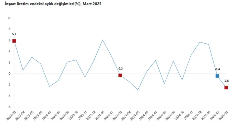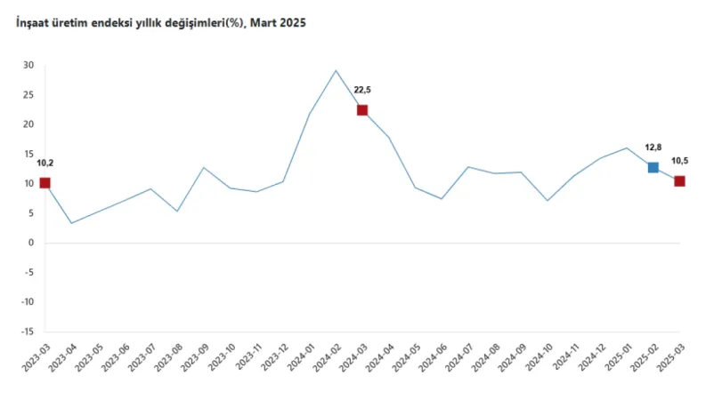 TÜİK, Mart 2025'e ilişkin İnşaat Üretim Endeksi'ni açıkladı. Verilere göre, Mart 2025'te inşaat üretimi yıllık olarak yüzde 10,5 arttı.