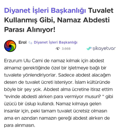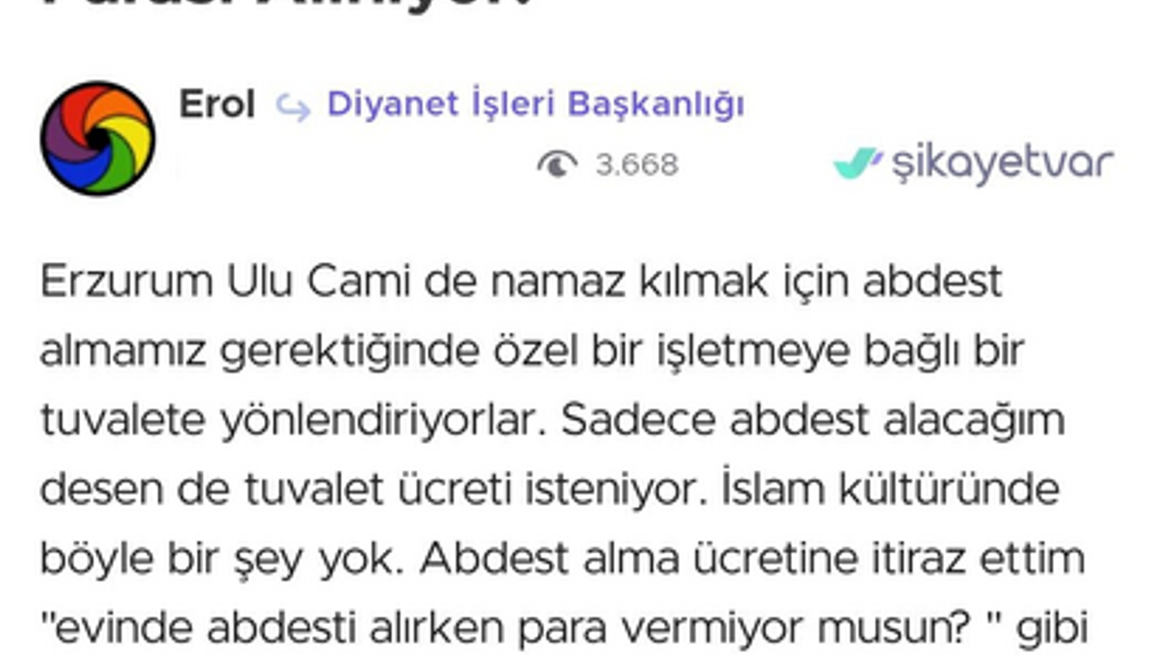 İslam kültüründe abdestin bir ibadet hazırlığı olduğuna dikkat çeken şikayet sahibi, bu hizmetin ticari işletmelere bırakılmasını doğru bulmadığını ifade etti.