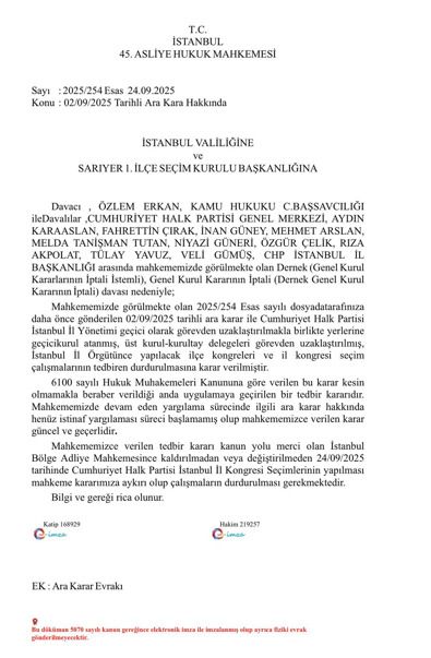 "Mahkememizde görülmekte olan 2025/254 Esas sayılı dosyadatarafınıza daha önce gönderilen 02/09/2025 tarihli ara karar ile Cumhuriyet Halk Partisi İstanbul İl Yönetimi geçici olarak görevden uzaklaştırılmakla birlikte yerlerine geçici kurul atanmış, üst kurul-kurultay delegeleri görevden uzaklaştırılmış, İstanbul İl Örgütünce yapılacak ilçe kongreleri ve il kongresi seçim çalışmalarının tedbiren durdurulmasına karar verilmiştir.