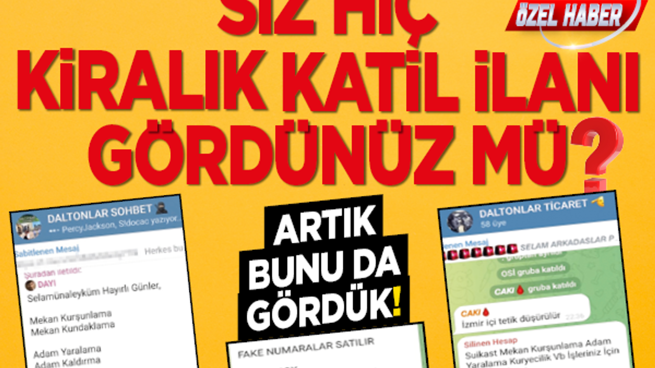 Gazetemizin ulaştığı yazışmalar, "tahsilat", "darb", "kurşunlama", hatta "ülke dışına kaçırma" gibi suç eylemlerinin, bir e-ticaret sitesinde ürün satar gibi alıcı bulduğunu gözler önüne seriyor. Telegram gibi şifreli uygulamalarda kurulan ve yüzlerce üyeye sahip olan 'Tetikçi Mekânı', 'İstanbul Tetikçi', 'Daltonlar' gibi gruplarda, suç ilanları birbiriyle yarışıyor.