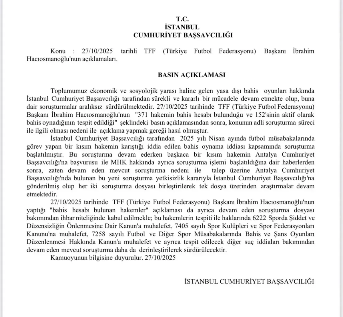 "Toplumumuz ekonomik ve sosyolojik yarası haline gelen yasa dışı bahis oyunları hakkında İstanbul Cumhuriyet Başsavcılığı tarafından sürekli ve kararlı bir mücadele devam etmekte olup, buna dair soruşturmalar aralıksız sürdürülmektedir. 27/10/2025 tarihinde TFF (Türkiye Futbol Federasyonu) Başkanı İbrahim Hacıosmanoğlu'nun "371 hakemin bahis hesabı bulunduğu ve 152'sinin aktif olarak bahis oynadığının tespit edildiği" şeklindeki basın açıklamasından sonra, konunun adli soruşturma süreci ile ilgili olması nedeni ile açıklama yapmak gereği hasıl olmuştur. İstanbul Cumhuriyet Başsavcılığı tarafından 2025 yılı Nisan ayında futbol müsabakalarında görev yapan bir kısım hakemin karıştığı iddia edilen bahis oynama iddiası kapsamında soruşturma başlatılmıştır. Bu soruşturma devam ederken başkaca bir kısım hakemin Antalya Cumhuriyet Başsavcılığı'na başvurusu ile MHK hakkında ayrıca soruşturma işlemi başlatıldığına dair haberlerden sonra, zaten devam eden mevcut soruşturma nedeni ile talep üzerine Antalya Cumhuriyet Başsavcılığı'nda bulunan bu yeni soruşturma yetkisizlik kararıyla İstanbul Cumhuriyet Başsavcılığı'na gönderilmiş olup her iki soruşturma dosyası birleştirilerek tek dosya üzerinden araştırmalar devam etmektedir.