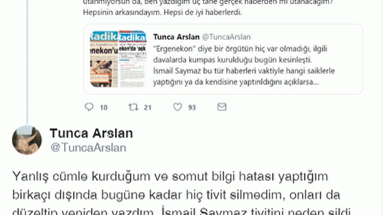 Gazeteci İsmail Saymaz ile sinema eleştirmeni Tunca Arslan arasında Ergenekon Davası haberlerine ilişkin sosyal medyada tartışma yaşandı. Saymaz'ın 2008 yılında Radikal gazetesinde Ergenekon'a ilişkin yaptığı haberlerin küpürlerini paylaşan Tunca Arslan, "Ergenekon diye bir örgütün hiç var olmadığı, ilgili davalarda kumpas kurulduğu bugün kesinleşti. İsmail Saymaz bu tür haberleri vaktiyle hangi saiklerle yaptığını ya da kendisine yaptırıldığını açıklarsa gazeteciliğine halel gelmez. Aksi takdirde sonsuza kadar susması gerekir." diye yazdı.