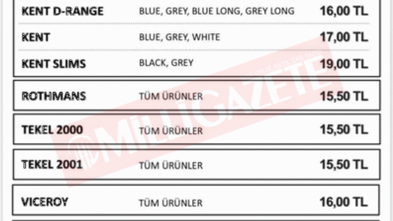 Philip Morris sigara fiyat listesi, Jti sigara fiyat listesi, BAT sigara fiyat listesi güncel tablosunda; Marlboro Touch, Marlboro, Kent sigara fiyatı, Muratti, Lark, Maltepe, Kent Slims, LM ve Winston, Parliament sigara fiyatı yer almaktadır.