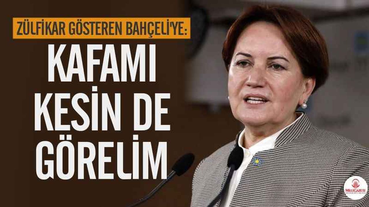 İYİ Parti lideri Meral Akşener, ‘Türk Gençliği Büyük Kurultayı’ndaki konuşmasında partililere zülfikâr gösteren MHP Genel Başkanı Devlet Bahçeli'ye cevaben, “Kabadayılık yapan tosunlara buradan sesleniyorum. 2012'de neler yaşandı bu ülkede, o kabadayılığı gösteremeyen ağzı dili lal olmuşlar, doğru ya elinizde bilgisayar vardı, bugün elinize zülfikâr verilmişse buyurun gelin kesin kafamı da görelim.” diye konuştu.