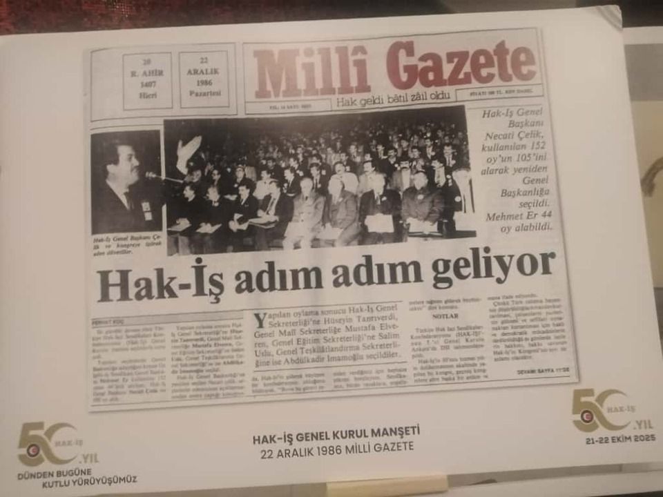 HAK-İŞ Konfederasyonu, 50’nci kuruluş yıl dönümünü “Emeğin Evrensel Gücü Hak-İş 50 Yaşında” temasıyla Ankara’da düzenlenen bir programla kutladı. Etkinlikte, yarım asırlık sendikal mücadelenin simgesi haline gelen Millî Gazete de yer aldı. Kurulduğu günden bu yana hakkın, emeğin ve emekçinin yanında duran Millî Gazete’nin tarihî manşetleri, Hak-İş’in emek merkezli mücadelesine basın cephesinden tanıklık etti.