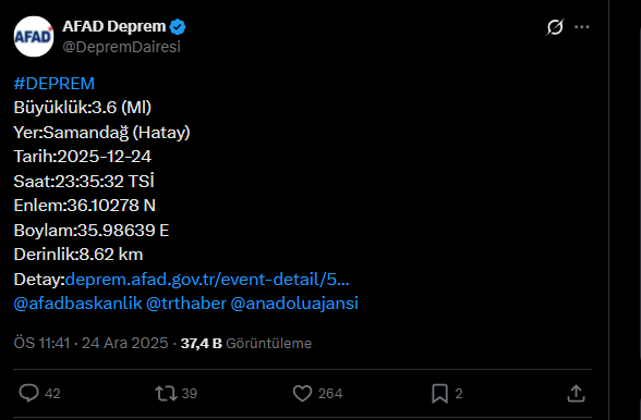 AFAD tarafından yapılan açıklamada, depremin merkez üssünün Samandağ olduğu belirtilerek, “Saat 23.35’te Hatay Samandağ merkezli, 3.6 büyüklüğünde bir deprem meydana gelmiştir” bilgisi paylaşıldı. Açıklamada, depremin yerin 8,62 kilometre derinliğinde gerçekleştiği kaydedildi.