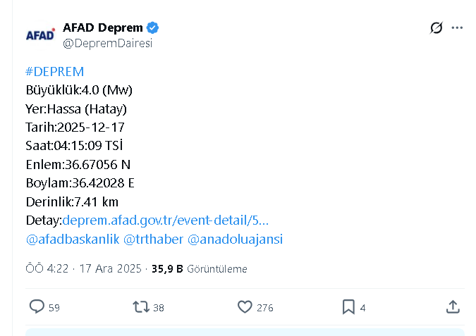 Afet ve Acil Durum Yönetimi Başkanlığı’nın (AFAD) internet sitesinde yer alan bilgilere göre, depremin merkez üssünün Hassa ilçesi olduğu bildirildi. Sarsıntının yerin 7,41 kilometre derinliğinde meydana geldiği açıklandı.