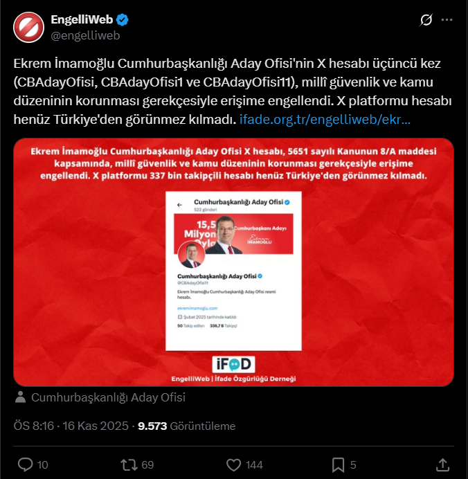 8 Mayıs’ta İmamoğlu’nun ‘@ekrem_imamoglu’ X hesabı erişime engellenmişti. Hesabı yaklaşık 10 milyon kişi takip ediyordu.
