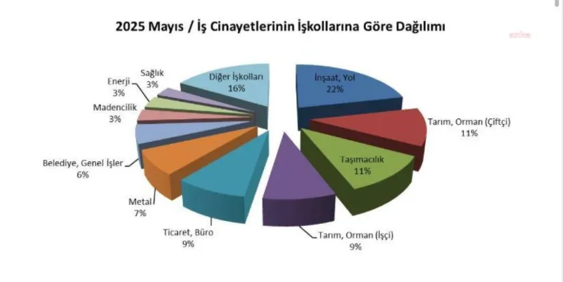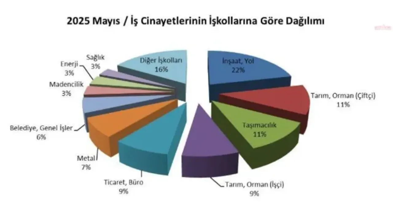 İSİG Meclisi, mayıs ayına ilişkin ''İş Cinayeti Raporu''nu açıkladı. Rapora göre, mayıs ayında 177 işçi, iş cinayetlerinde hayatını kaybetti. İşkollarına göre ölümlerin yüzde 22’si inşaat/yol, yüzde 11 taşımacılık, yüzde 11 tarım/orman (çiftçi), yüzde 9 tarım/orman (işçi), yüzde 9 ticaret/büro, yüzde 7 metal işkollarında yaşandı.