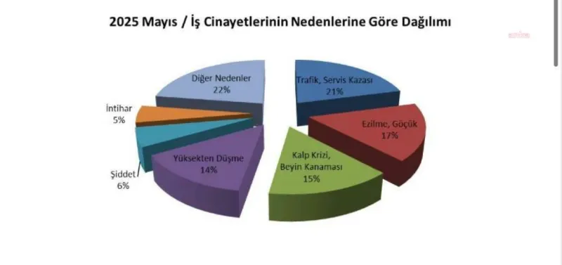 Raporda, ölüm sebeplerine göre iş cinayetlerinin yüzde 21’inin trafik servis kazası, yüzde 17’sinin ezilme, yüzde 15’inin kalp krizi ve beyin kanaması, yüzde 14’ünün yüksekten düşmeden kaynaklı yaşandığı belirtildi.