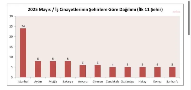 Rapora göre, mayıs ayında Türkiye’nin 54 şehrinde ve yurt dışında bir ülkede (kısa vadeli çalışmak için gidilen veya Türkiye menşeili şirketlerde çalışan) iş cinayeti gerçekleştiği tespit edildi.