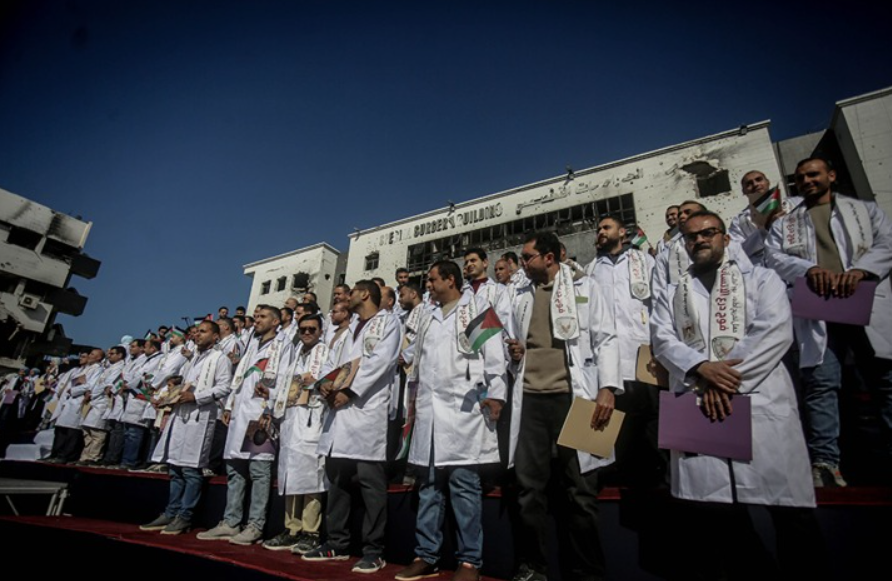 Gazze Sağlık Bakan Yardımcısı Yusuf Ebu er-Riş, törende yaptığı konuşmada, 168 doktorun bombardıman altında ve ağır yıkımın ortasında uzmanlık eğitimlerini tamamladığını açıkladı.