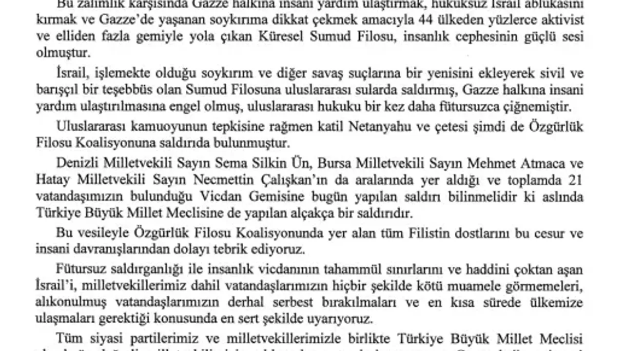 "İsrail, işlemekte olduğu soykırım ve diğer savaş suçlarına bir yenisini ekleyerek sivil ve barışçıl bir teşebbüs olan Sumud Filosu'na uluslararası sularda saldırmış, Gazze halkına insani yardım ulaştırılmasına engel olmuş, uluslararası hukuku bir kez daha fütursuzca çiğnemiştir. Uluslararası kamuoyunun tepkisine rağmen katil Netanyahu ve çetesi şimdi de Özgürlük Filosu Koalisyonu'na saldırıda bulunmuştur. Denizli Milletvekili Sayın Sema Silkin Ün, Bursa Milletvekili Sayın Mehmet Atmaca ve Hatay Milletvekili Sayın Necmettin Çalışkan'ın da aralarında yer aldığı ve toplamda 21 vatandaşımızın bulunduğu Vicdan Gemisi'ne bugün yapılan saldırı bilinmelidir ki aslında TBMM'ye de yapılan alçakça bir saldırıdır. Bu vesileyle Özgürlük Filosu Koalisyonu'nda yer alan tüm Filistin dostlarını bu cesur ve insani davranışlarından dolayı tebrik ediyoruz."