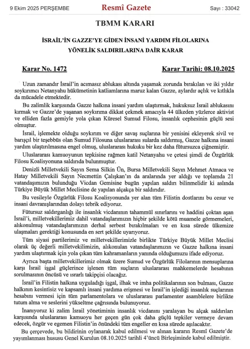 Ayrıca başta milletvekillerimiz olmak üzere Sumud ve Özgürlük filolarının mensuplarına karşı İsrail işgal güçlerince işlenen tüm suçların uluslararası mahkemelerde hesabının sorulmasının öncüsü ve ısrarlı takipçisi olacağız. İsrail'in Filistin halkına uyguladığı işgal, ilhak ve imha politikalarının son bulması, Gazze halkının kesintisiz ve kapsamlı insani yardıma erişmesi ve İsrail'in işlediği insanlık suçlarının hesabını vermesi için tüm parlamentolara ve uluslararası parlamenter asamblelere birlikte tutum alma ve seslerini yükseltme çağrısında bulunuyoruz. İnanıyoruz ki zalim İsrail yönetiminin insanlık vicdanını yaralayan bu alçak saldırıları karşısında uluslararası kamuoyu her geçen gün çok daha güçlü tepkiler vermeye devam edecek, özgür ve egemen Filistin'in önündeki tüm engeller en kısa sürede aşılacaktır. Bu çerçevede, bu bildirinin oylanarak kabul edilmesi ve alınan kararın Resmi Gazete'de yayımlanması hususu Genel Kurulun 08.10.2025 tarihli 4'üncü birleşiminde kabul edilmiştir."
